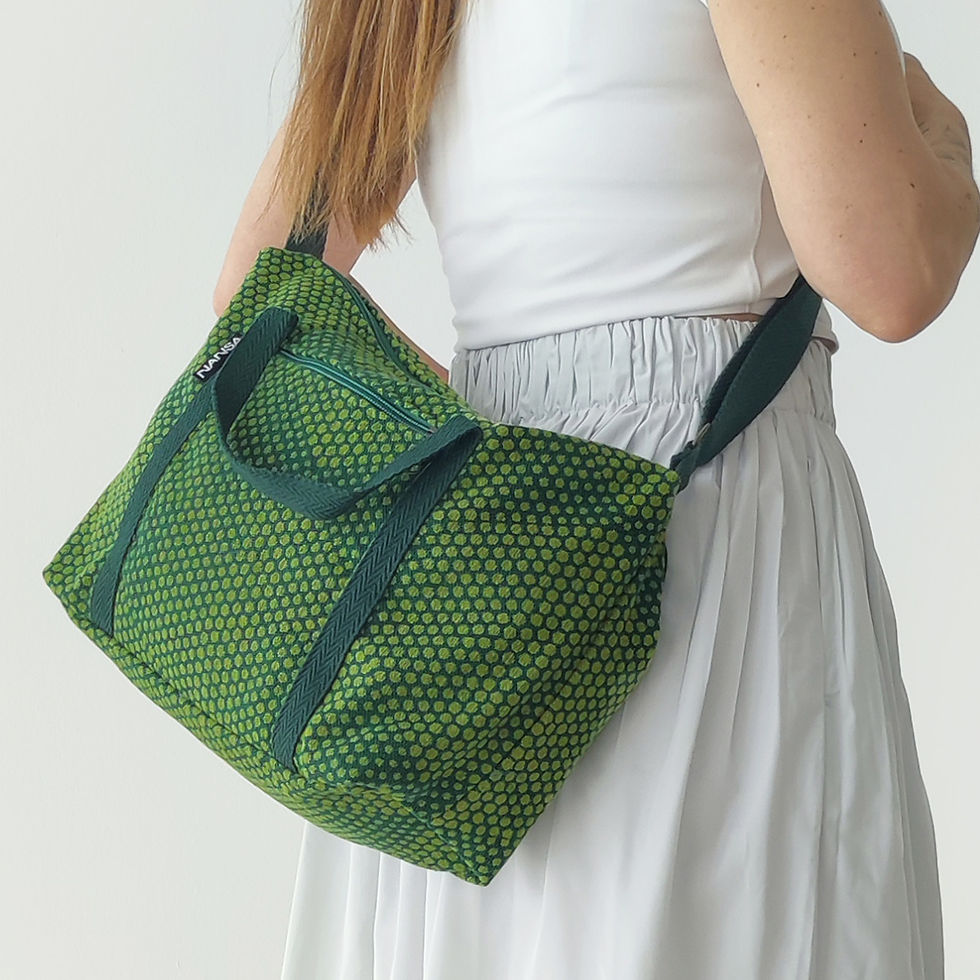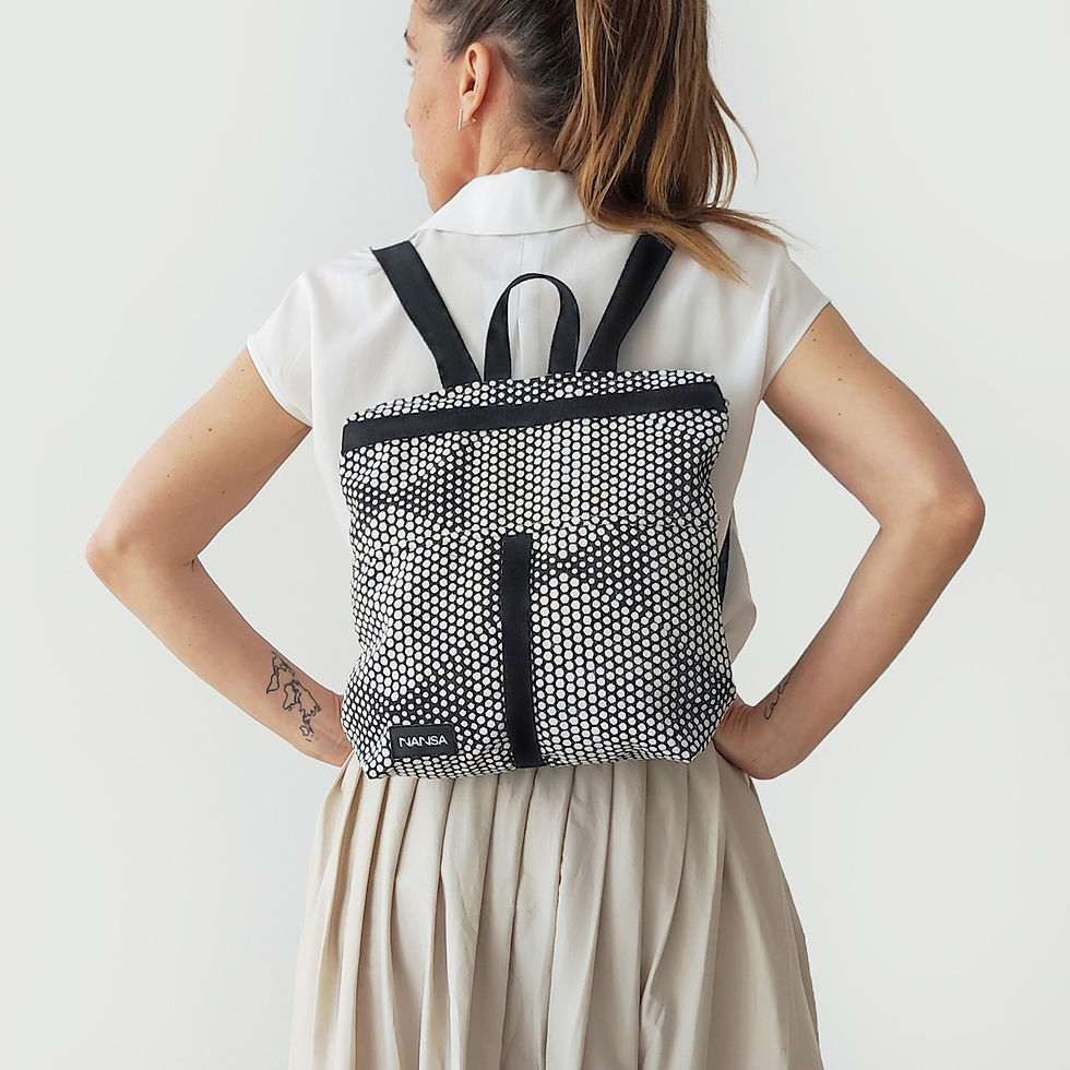 Puput (topos blanco y negro/asa teja y cremall. negra)